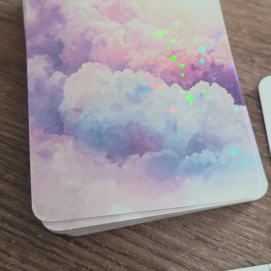 Die Karten haben wieder eine Größe von ca. 7 x 10 cm und sind mit einer holografischen Sternenfolie laminiert.